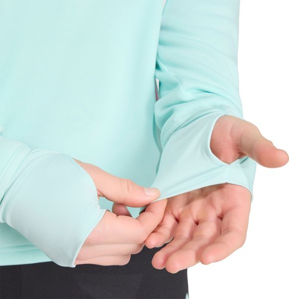 Besonders praktisch ist die weitenregulierbare und verstaubare Sturmhaube, die bei Bedarf schnell einsatzbereit ist. Die umschlagbaren Handschützer in den Ärmelbündchen bieten zusätzlichen Schutz für die Hände und sind ein durchdachtes Detail für kalte Trainingstage. Gefertigt aus 100 % recyceltem Polyester, vereint das Oberteil Nachhaltigkeit mit Funktionalität.