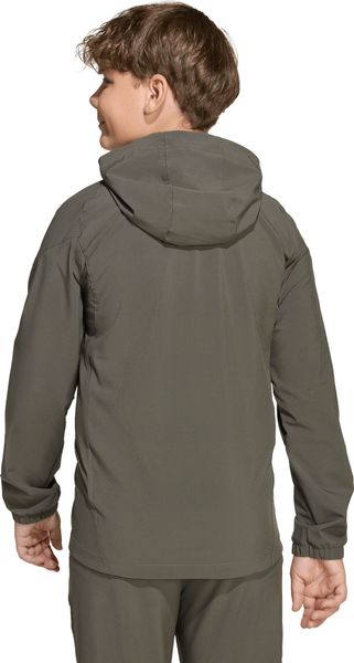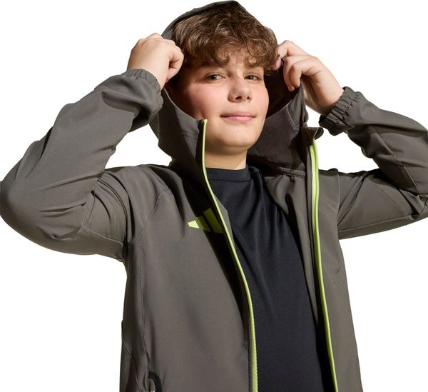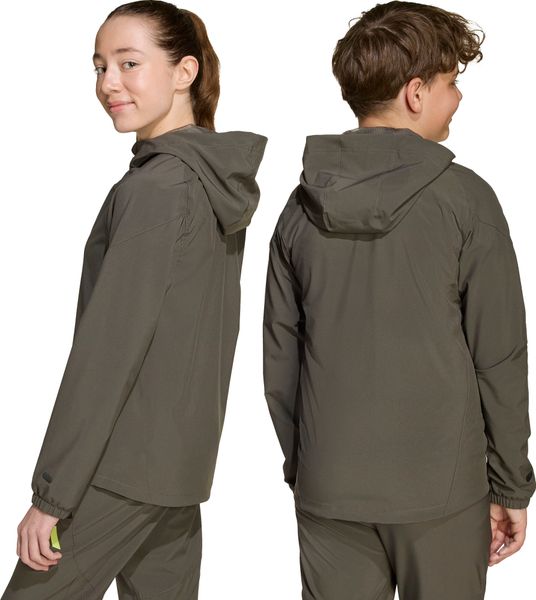 Ausgestattet mit einem durchgehenden Zwei-Wege-Reißverschluss und einer weitenregulierbaren Kapuze mit Gummizug, bietet die Jacke optimalen Schutz bei wechselhaftem Wetter. Die vorderen Reißverschlusstaschen bieten sicheren Stauraum für kleine Gegenstände. Das elastische Material und die AEROREADY-Technologie gewährleisten, dass Feuchtigkeit schnell abgeleitet wird, sodass Kinder und Teens auch bei intensiven Aktivitäten trocken und komfortabel bleiben.