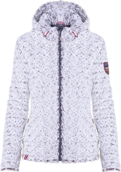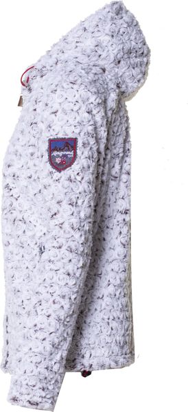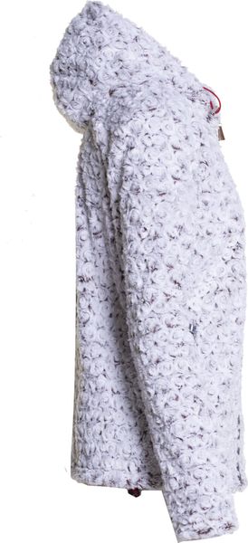 Taillierte Damenjacke aus flauschigem Teddyplüsch mit Rosenstruktur und Hirschhornanhängern, ideal für stilvolle Freizeitmode.