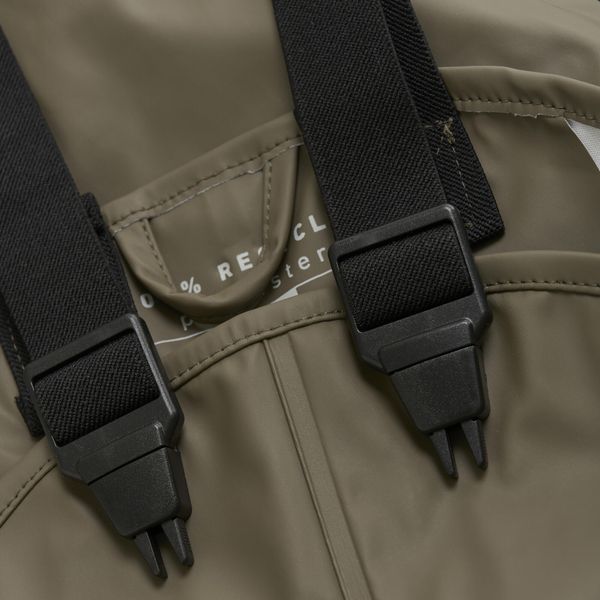 Die Regenhose ist in den Größen 70-100 mit verstellbaren elastischen Hosenträgern und Druckknöpfen an den Seiten ausgestattet, die eine perfekte Passform garantieren. Alle Größen verfügen über verstellbare elastische Fußschlaufen, die sicherstellen, dass die Hose auch beim Herumtollen im Regen eng an den Gummistiefeln bleibt. Für zusätzlichen Komfort in der Übergangszeit lässt sich problemlos Thermokleidung darunter tragen. Das Set ist zudem GRS-zertifiziert (CERES-0366), was die nachhaltige und umweltfreundliche Herstellung unterstreicht.