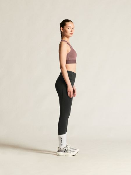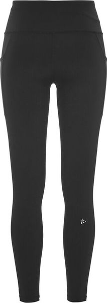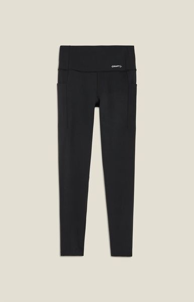 Besonders praktisch sind die zwei großen Außentaschen an den Beinen, in denen wichtige Utensilien wie Handy oder Energieriegel sicher verstaut werden können. Diese Funktionalität macht die Tights ideal für längere Läufe oder intensive Trainingseinheiten, bei denen man die Hände frei haben möchte. Der dezente Craft-Logo-Print vorne und das Six-Dot-Logo hinten verleihen den Tights zudem einen modernen und sportlichen Look.