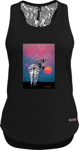 Ein Highlight des Tops ist der gekreuzte Falten-Rücken, der nicht nur einen modischen Akzent setzt, sondern auch für eine optimale Passform sorgt. Die amerikanischen Träger und der obere Rücken aus gefärbtem Spitzenstoff verleihen dem Top einen Hauch von Eleganz und machen es zu einem echten Hingucker. Die exklusiven Designs mit Siebdruck und Aufnähern unterstreichen den einzigartigen Look dieses Lifestyle-Tops.