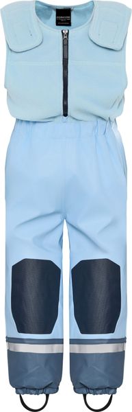 Die Jacke des Sets ist mit warmem Mikrofleece gefüttert und verfügt über eine abnehmbare Kapuze, die sich an die Bedürfnisse des Kindes anpassen lässt. Elastische Seiten und verstellbare Träger sorgen für eine bequeme Passform, während der Frontreißverschluss durch eine zusätzliche Klettverschluss-Klappe geschützt wird. Reflektierende Details erhöhen die Sicherheit durch bessere Sichtbarkeit bei schlechten Lichtverhältnissen.