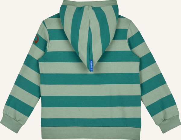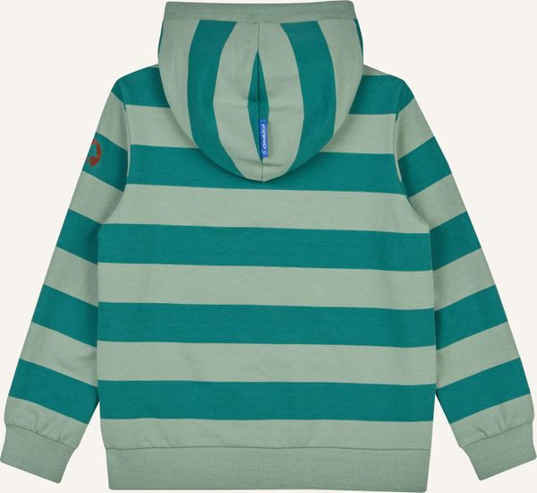 Nachhaltige Sweatjacke aus Biobaumwolle mit Zip-in-Funktion und fröhlichen Blockstreifen für kühle Tage und späte Abende.