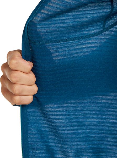 Besonders durchdacht ist das Design der Jacke: Verlegte Schulternähte und Flachnähte verhindern Reibung, während Daumenlöcher die Ärmel sicher an Ort und Stelle halten und gleichzeitig für warme Hände sorgen. Die Unterarmeinsätze aus Eyelet-Mesh bieten zusätzliche Ventilation, was bei anstrengenden Wanderungen besonders vorteilhaft ist. Eine versteckte Brusttasche bietet praktischen Stauraum für kleine Gegenstände, während die Kapuze zusätzlichen Schutz bei wechselnden Wetterbedingungen bietet.