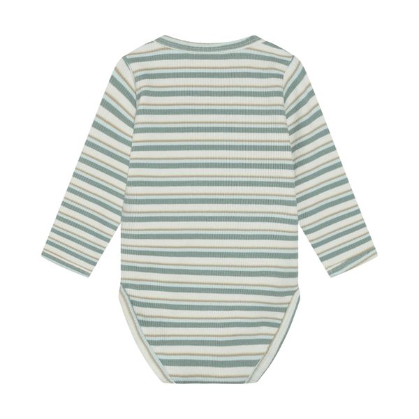 Bequemer und stilvoller Body aus biologischer Baumwolle mit Streifenmuster und praktischen Druckknöpfen.