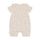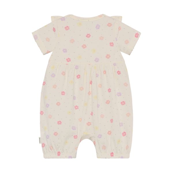 Die kurzen Ärmel und Beine sind ideal für warme Tage und sorgen für ausreichend Bewegungsfreiheit. Besonders hervorzuheben sind die wellenförmigen Ränder an den Ärmeln und der elastische Rand an den Beinen, die dem Overall eine besondere Note verleihen. Praktisch und durchdacht ist die Druckknopfleiste zwischen den Beinen, die ein einfaches An- und Ausziehen ermöglicht und somit den Alltag erleichtert.