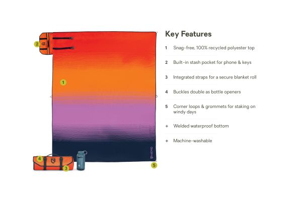 Die Victory Patio Blanket von Nemo ist der perfekte Begleiter für all Ihre Outdoor-Abenteuer. Diese vielseitige Decke kombiniert Funktionalität mit Stil und bietet Ihnen eine robuste und dennoch weiche Unterlage für zahlreiche Aktivitäten wie Wandern und Wassersport. Dank des knitterfreien Obermaterials aus 100 % recyceltem Polyester mit lebhaftem Muster und der strapazierfähigen, wasserdichten TPU-Unterseite sind Sie bestens vor Schmutz, Sand und Wasser geschützt.