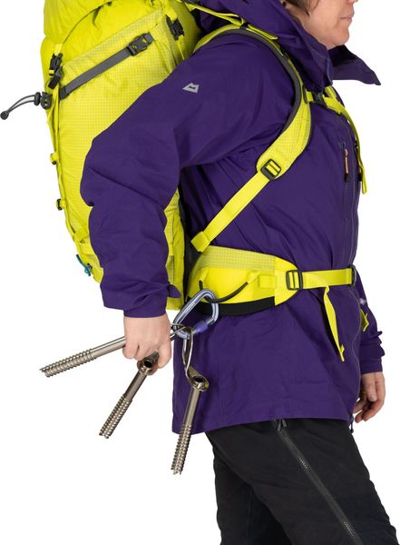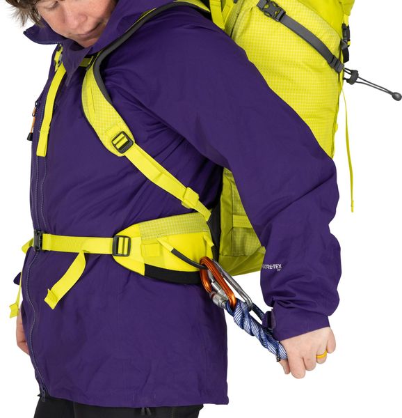 • Zwei Ausrüstungsschlaufen am Hüftgurt und Befestigungsschlaufen für Eisausrüstung