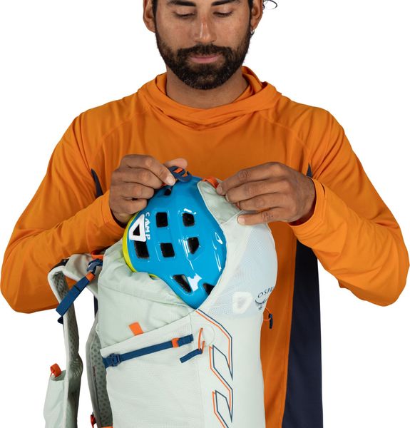 - In das elastische Mesh-Einschubfach vorne passt ein Helm
