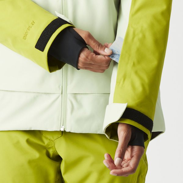 Vielseitige Damen-Skijacke mit umweltfreundlichem Design, wasserdicht und atmungsaktiv für maximalen Komfort beim Skifahren.