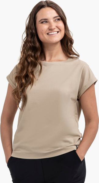 Luftiges Damen-T-Shirt mit 4-Wege-Stretch, femininen Details und umweltfreundlichem Material für urbanen Komfort.