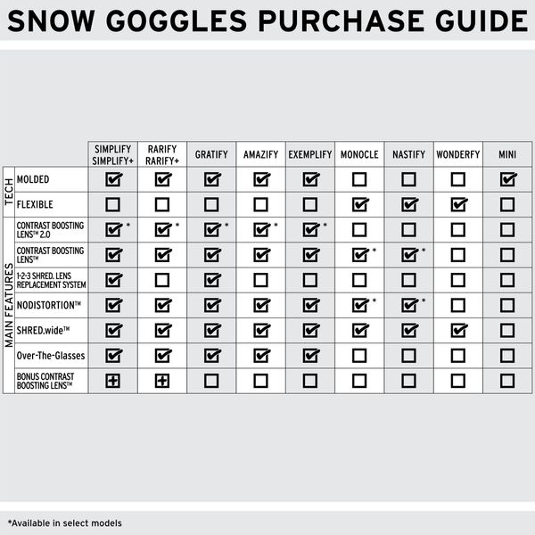 - SHRED.wide™ | Die Brille wurde entwickelt und konstruiert, um Ihr Sichtfeld zu maximieren ||SHRED. CONTRAST BOOSTING LENS™ | Verbessert den Bildkontrast und die Bildschärfe bei allen Wetter- und Lichtverhältnissen || SHRED. CONTRAST BOOSTING LENS™ 2.0* Verbessert den Bildkontrast und die Bildschärfe bei allen Wetter- und Lichtverhältnissen, indem flaches Licht und Blendeffekte unterdrückt werden. *Erhältlich in ausgewählten Modellen.|SHRED. NODISTORTION™ | Druckregulierungsventil-Technologie für kristallklare Sicht bei Höhenunterschieden.|1-2-3 SHRED. REPLACEMENT SYSTEM™ | Schneller und einfacher Scheibenwechsel in 3 Schritten.|SHRED. NOCLOG™ | Hydrophobe Behandlung an den Belüftungsöffnungen, um das Verstopfen durch Schnee oder Wasser zu reduzieren und ein Beschlagen zu verhindern.|SHRED. OTG | Entwickelt, um Kompatibilität und Komfort mit den meisten Korrektionsbrillen zu gewährleisten.