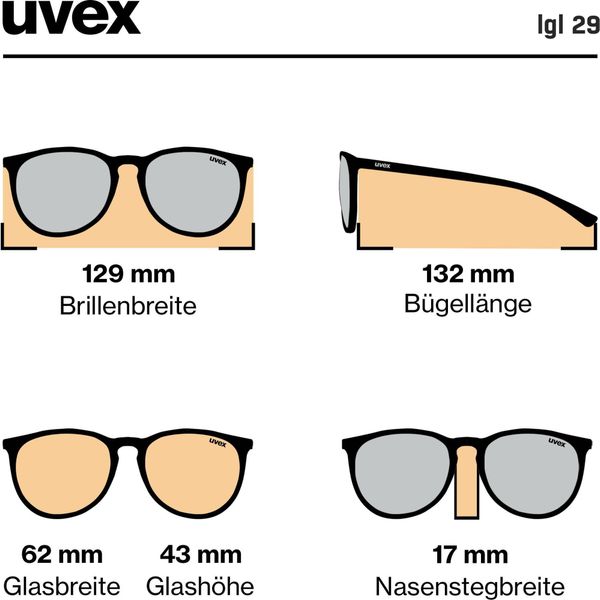 Mit einer Brillenbreite von 137 mm und Bügellänge von 132 mm passt die uvex LGL 29 perfekt auf viele Gesichtsformen und bietet hohen Tragekomfort. Der Nasensteg von 17 mm sorgt für sicheren Halt, während die Glasbreite und -höhe von 43 mm ein großzügiges Sichtfeld bieten. Die integrierten UV-Absorber gewährleisten, dass Ihre Augen auch bei intensiver Sonneneinstrahlung geschützt bleiben.